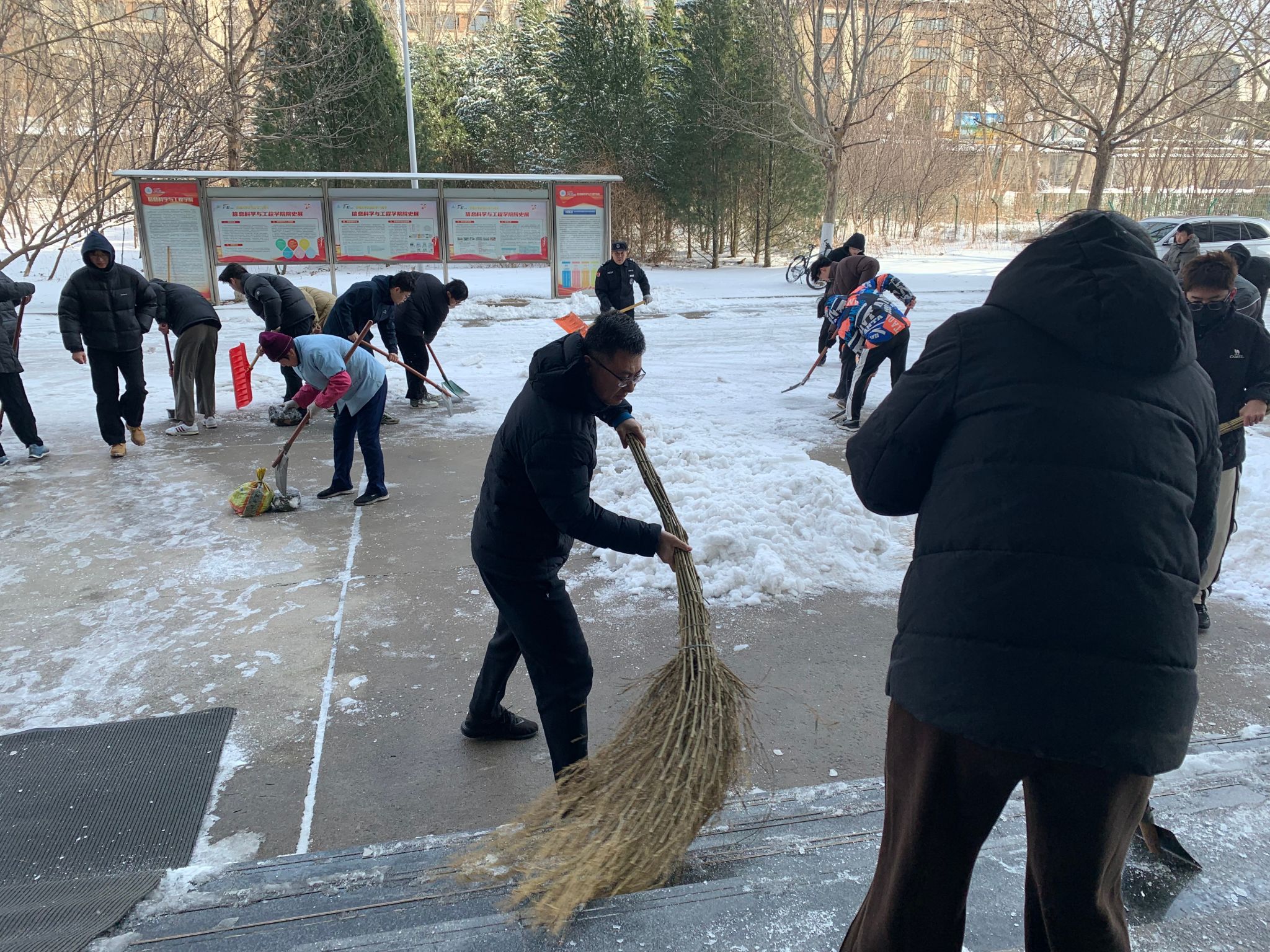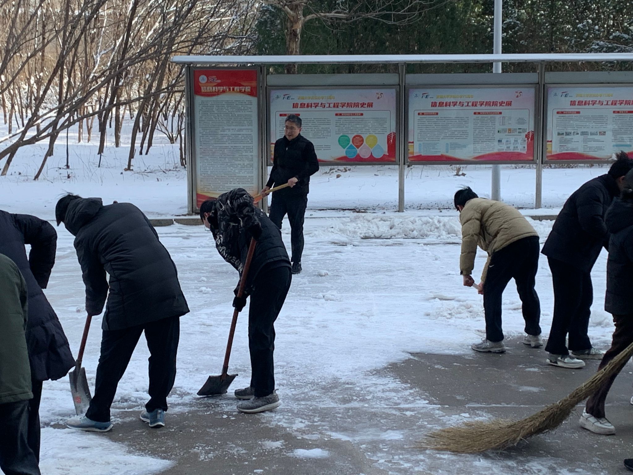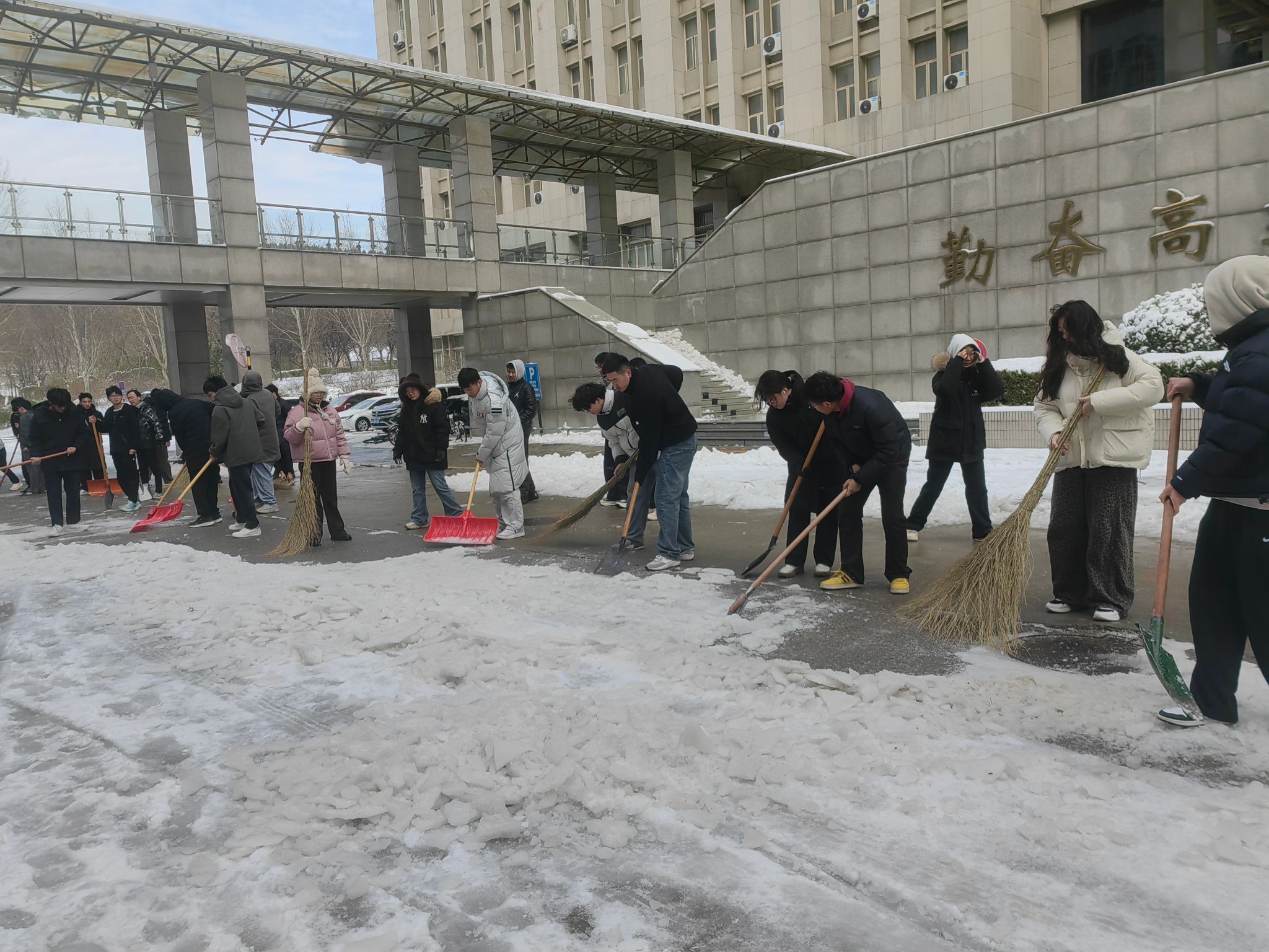 3月3日清晨,学院师生党员不畏严寒,携带好扫帚、铁锹等清扫工具,分批次到学院卫生责任区域开展扫雪除冰活动。大家头顶寒风却干劲十足,从学院主干道到12教学楼两侧,再到图书馆周边,齐心协力,配合默契,经过两个多小时的奋战,学院周边主干道路的积雪被清扫干净,学院师生党员用热情与汗水开辟出了一条安全方便的“暖心路”,用实际行动为为校园筑起了一道坚实的“安全屏障”。