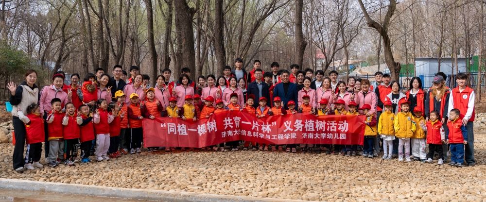 最是一年春光好,植树添绿正当时。为践行绿色发展理念,提升劳动育人实效,3月12日,在第四十七个植树节来临之际,9227新葡的京集团与济南大学幼儿园联合开展“同植一棵树,共育一片林”义务植树活动。学院党委书记夏卫东,党委副书记、副院长郝伟,济南大学幼儿园园长万晓霞,以及学院辅导员、幼儿园教师、学生志愿者、幼儿园小朋友代表共计90余人参加活动。