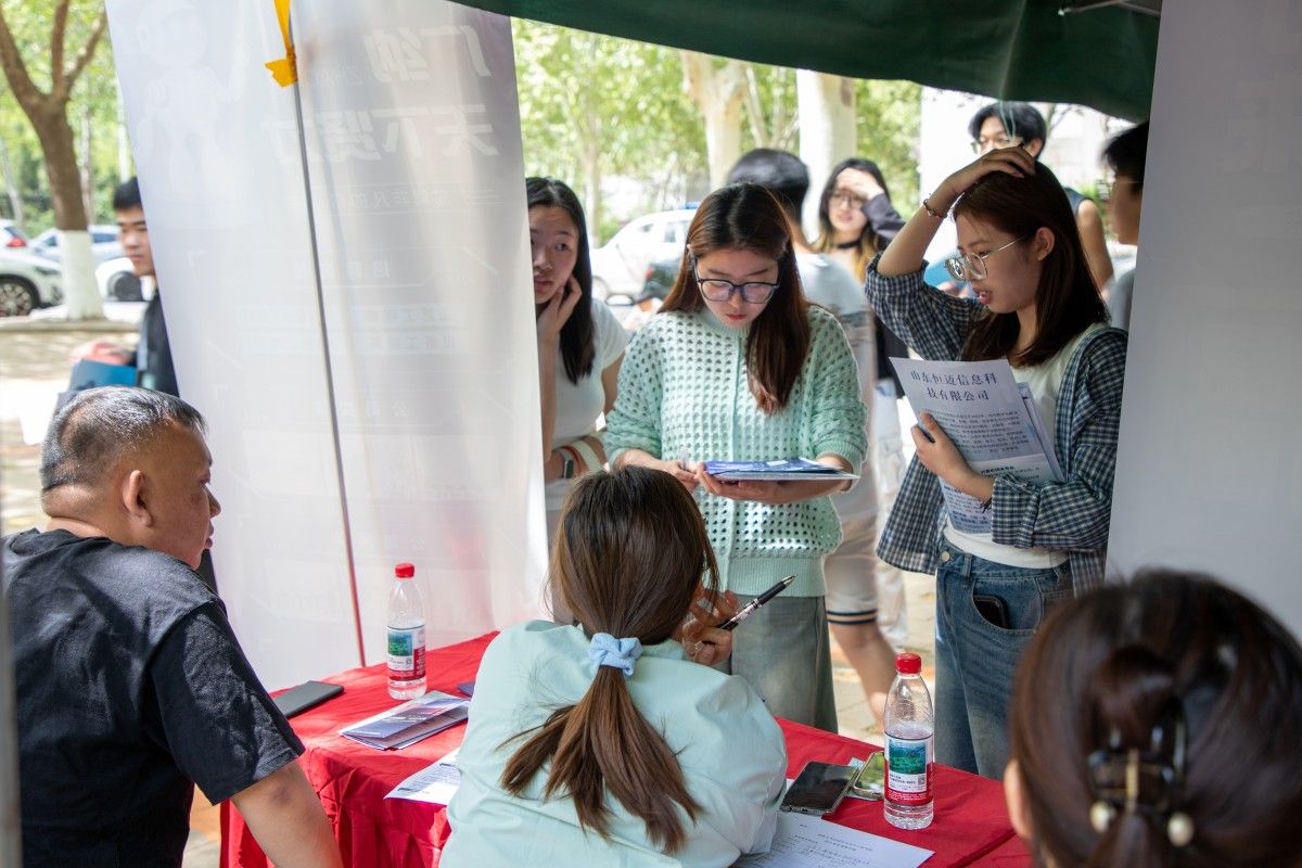 本次招聘会四个学院联合邀请了省内外近百家用人单位关注报名,通过精准摸排学生就业意向需求,精心筛选专业对口单位到校招聘,涵盖了中建八局、中铁十局、浪潮科技、泰阳和正、山大地纬、积成电子、亿安生物、水处理设备厂等企业,还特别邀请了济南市天桥区人社局、泰安市10余家企业、校友企业等,为2025届本科及硕士毕业生提供了2000余个优质岗位。招聘会现场,各学院毕业生就岗位职责、工作要求、发展前景等与意向单位交流自荐并投递简历,部分非毕业班学生也提前来了解用人单位招聘流程、应聘条件和岗位需求,现场气氛热烈、人潮涌动。此外,招聘会现场还设置了青鸟送岗、征兵宣传、生涯咨询、简历指导、留学咨询等功能专区,“零距离”为毕业生提供政策讲解、求职帮扶等就业服务以及多元化职业选择。