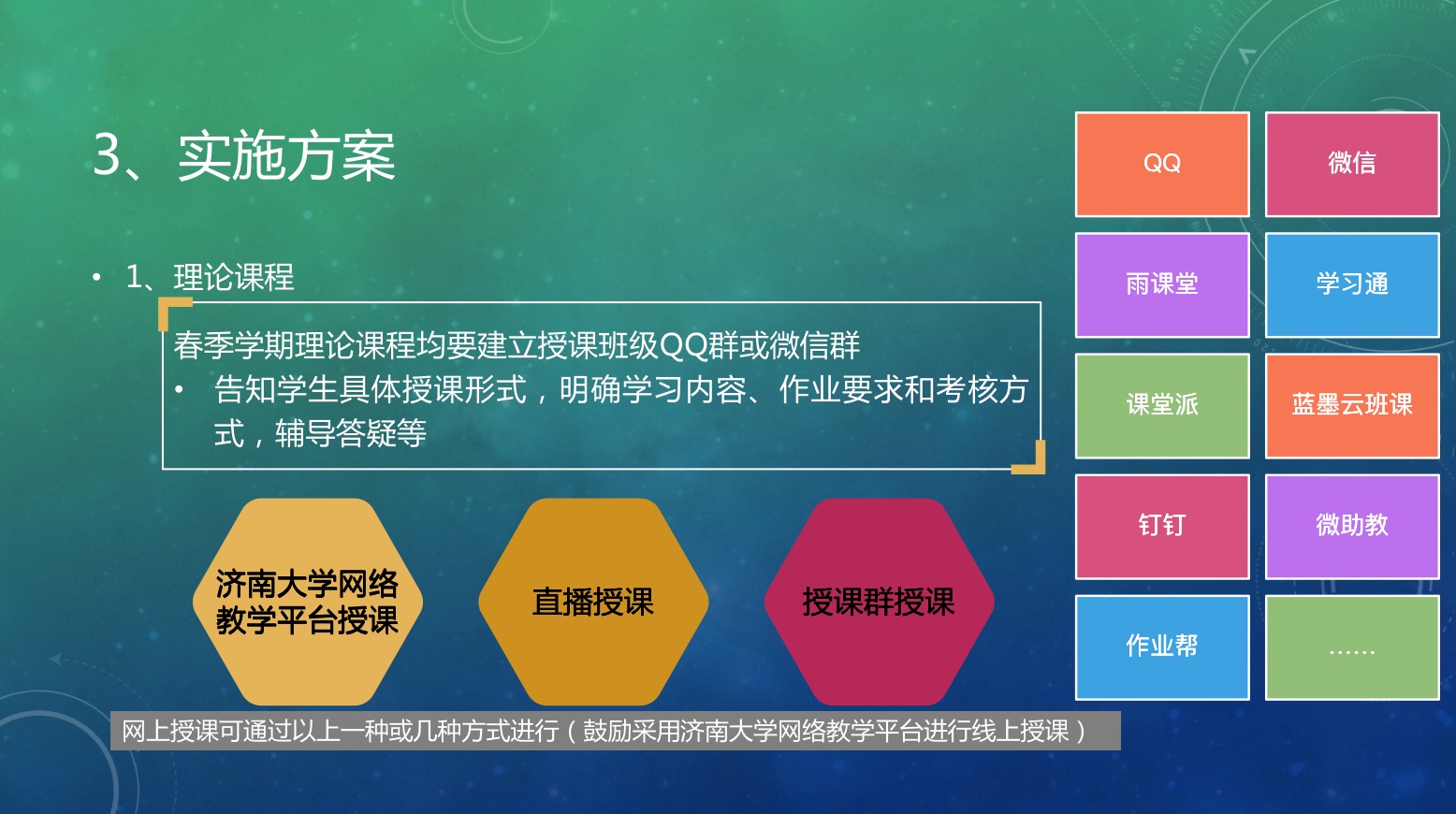 面对新冠肺炎疫情,信息学院按照教育部及济南大学教务处等相关部门发出的“延期开学不停学、停课不停教”的要求,迅速行动,制定《9227新葡的京集团2020年春季学期教学计划调整方案 》,保障学院疫情期间的教学科研工作有序开展。