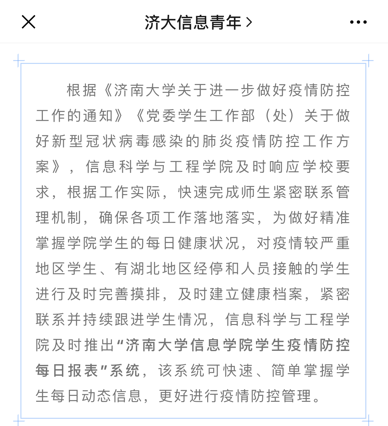 对于学院教职工,建立系部主任定期汇报制度,对本系部教师情况进行摸排汇总,并及时汇报;对全体学生,以年级、班级为单位,建立辅导员—主要学生干部—全班学生的疫情防控信息网,每日排查班级同学身体健康情况并汇总上报,实时掌握全院学生情况,并及时通过网络宣传、群发通知等方式号召同学们响应国家和学校号召,服从当地、学校、学院疫情防控工作安排,居家做好科学抗疫的带头者;对有湖北地区停留史、与相关人员有接触以及疫情较严重地区的学生及时进行完善摸排,推出“济南大学信息学院学生疫情防控每日报表”系统,通过系统可快速、全面的掌握学生每日动态信息,更有针对性的做好疫情防控工作。