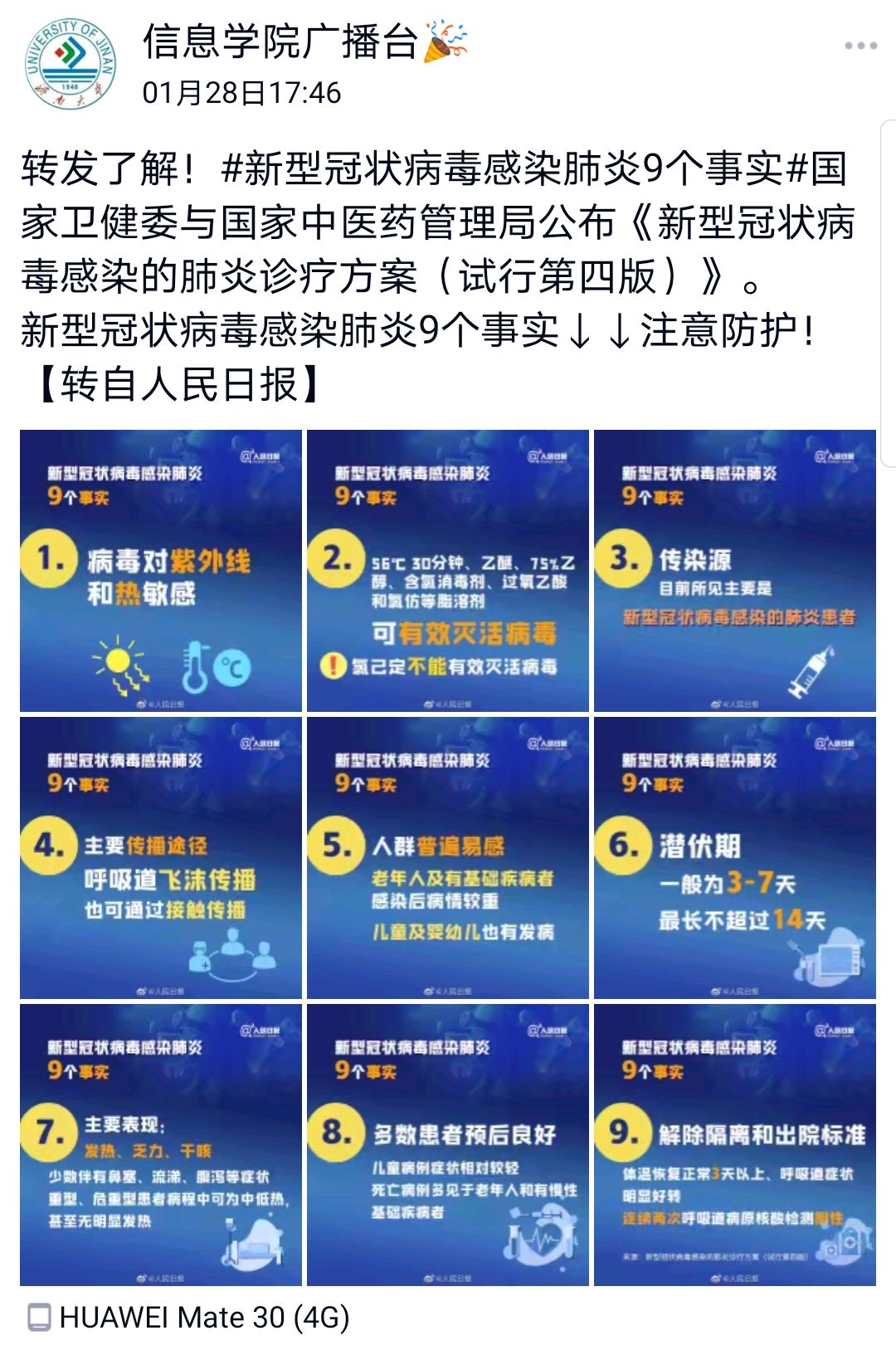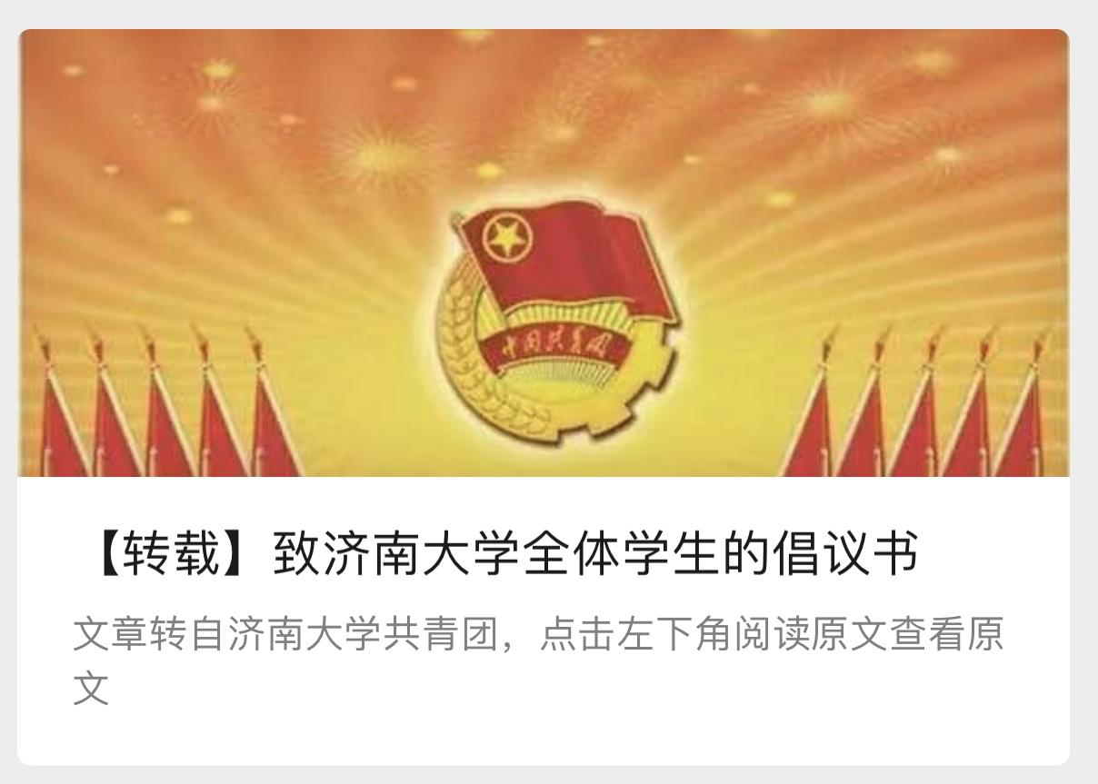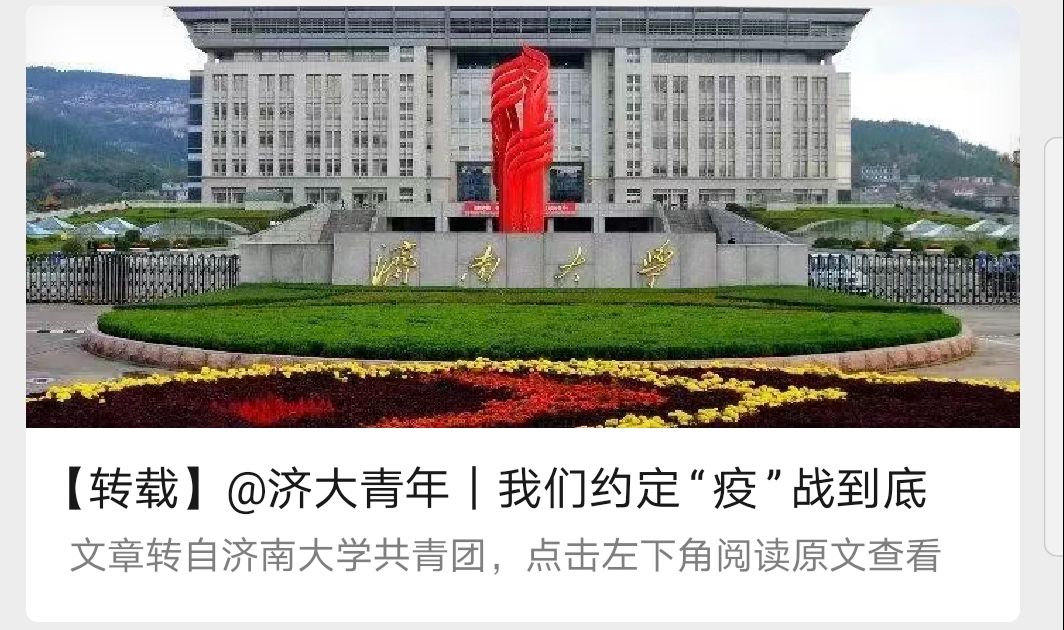 为提高全院学生新冠肺炎疫情防控意识,增强战胜疫情的信心和决心,学院积极做好疫情防控宣传工作,利用官方微信公众号、QQ群、QQ公众空间等阵地,宣传中央指示精神和学校学院防疫部署安排、普及防疫知识和要求,针对防控的各个环节、各类情况做好疫情防控的综合宣传工作,营造坚决打赢疫情防控阻击战的良好舆论环境。同时,学院在第一时间将济南大学《致济南大学全体学生的倡议书》、《@济大青年|我们约定“疫”战到底》通过微信推送的形式发送至每位同学并及时发布《新型肺炎的公共场所卫生防护指南》、原创微信文章《共度难关,我们在一起》,将抗疫正能量传递给信院每位青年。