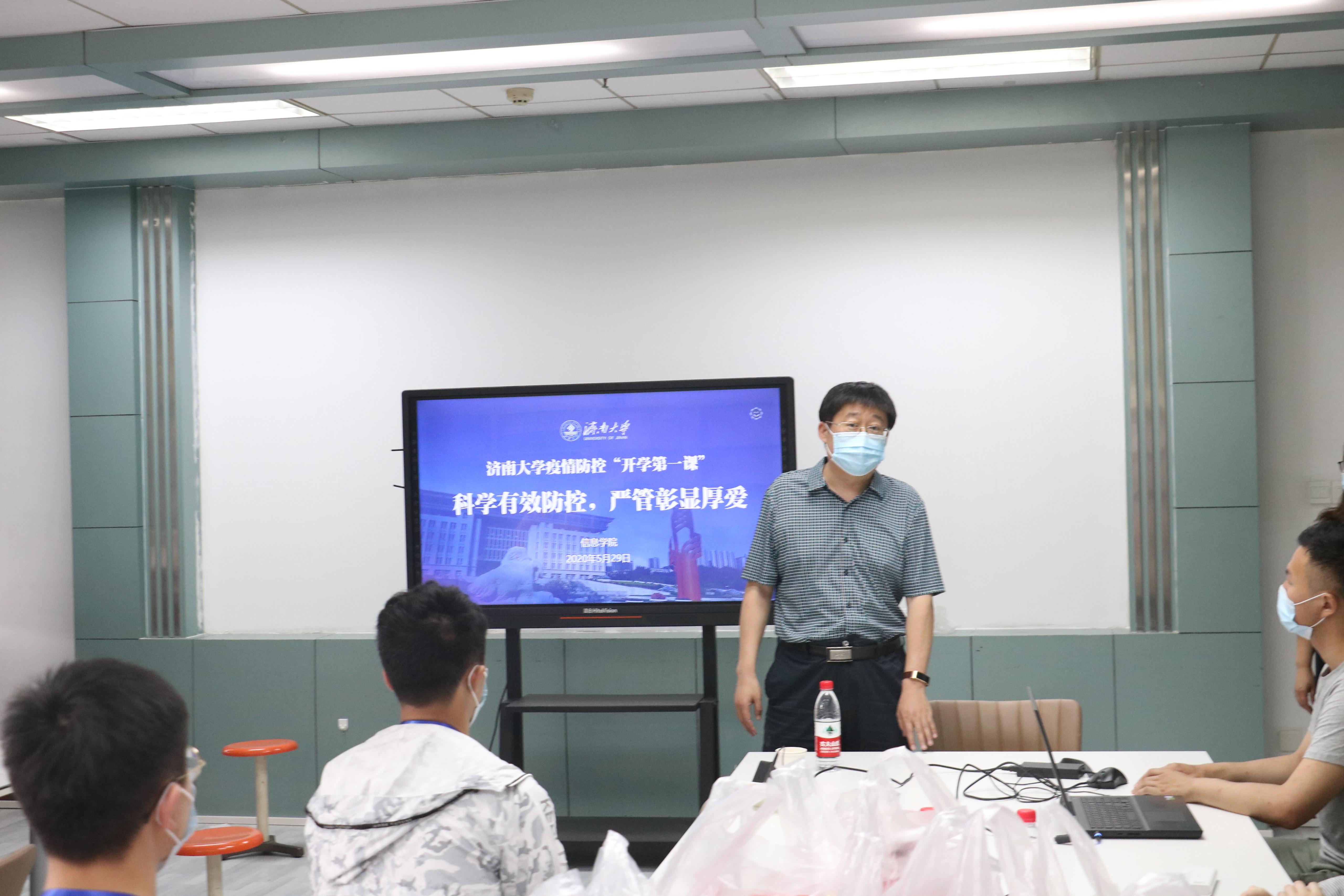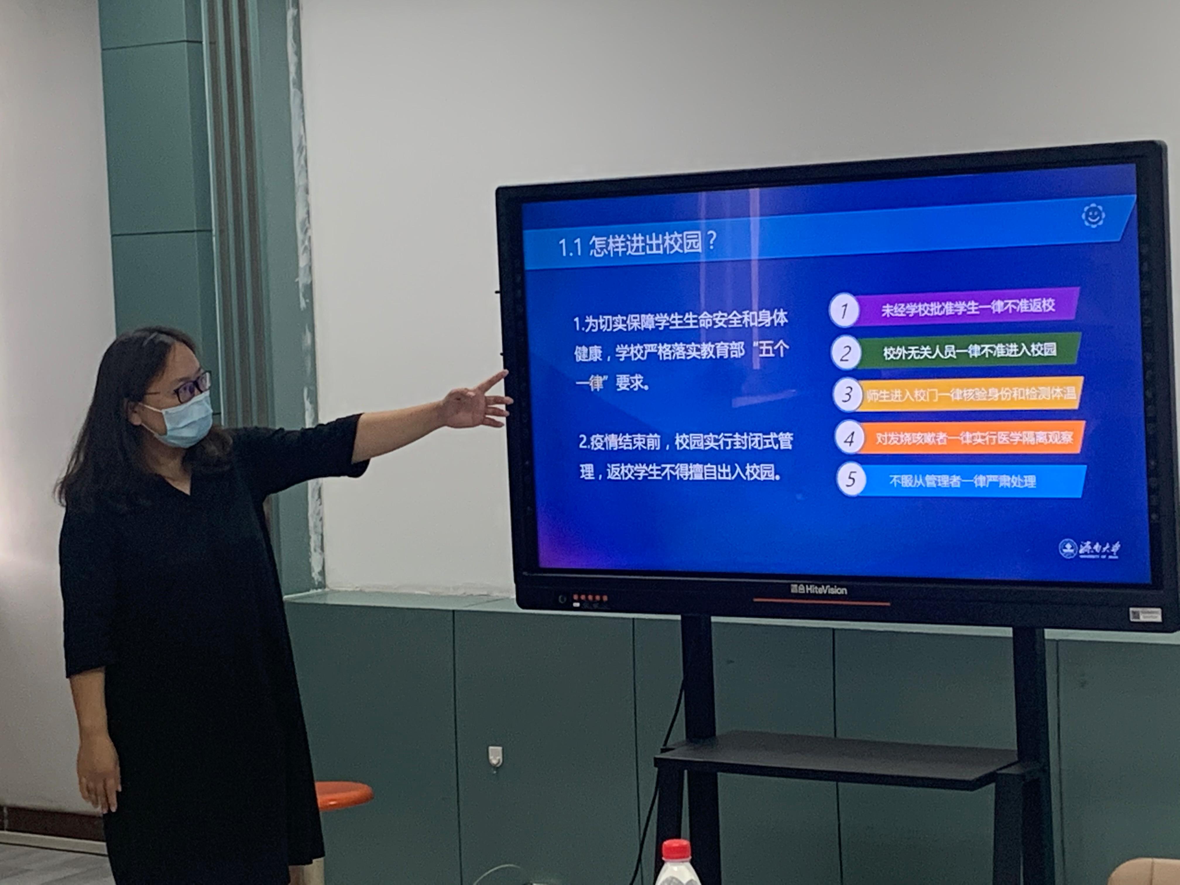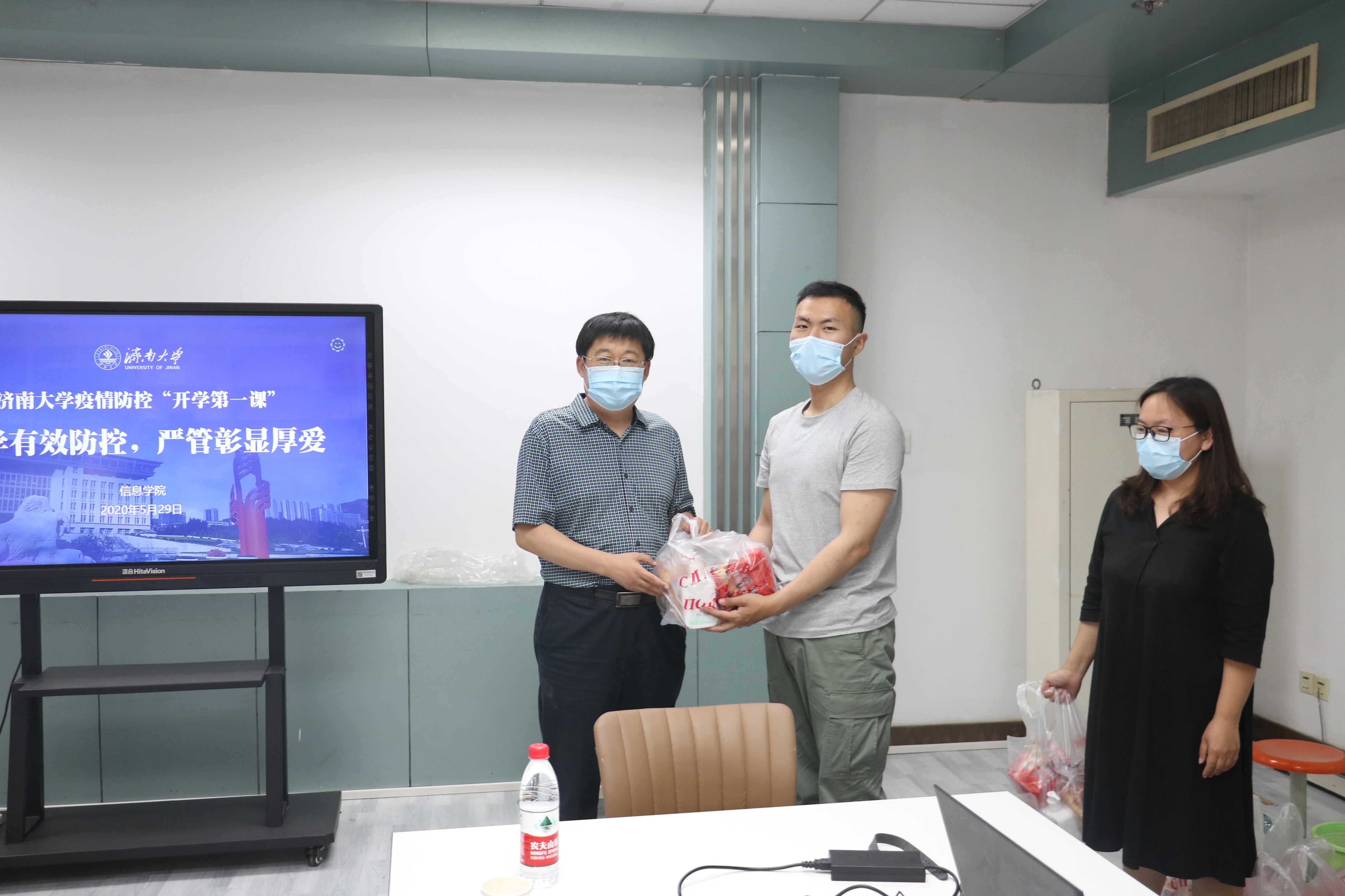学生工作办公室主任付颖颖进行“开学第一课”授课。她带领同学们共同观看了《新冠肺炎基本知识》《六步洗手法》《含氯消毒液的配制和使用》《口罩的正确选用和使用》《济南大学疫情防控应急演练》《厚植家国情怀,诠释责任担当》6个防疫相关视频。结合《济南大学疫情防控实用指导手册》《济南大学学生违反疫情防控相关纪律的处理方案》,为同学们详细讲授了在校期间进出校园、宿舍防护、就餐、个人健康监测等多方面日常纪律要求,教育引导学生严格遵守党和国家关于疫情防控的法律法规,增强法治意识和爱校荣校意识。会后,学院为返校学生发放“健康大礼包”。