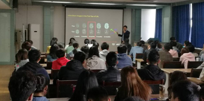 王利助理教授作了题为“Infant Brain MRI Analysis ”的学术报告。报告会上,王利教授结合了婴儿MRI技术的最新进展,介绍了基于学习的婴儿大脑图像分析方法,包括大脑和小脑、海马亚区的组织分割,以及早期诊断自闭症的成像生物标记。并且展示了婴儿第一年的脑部发育历程,这将大大增加人们对正常早期脑部发育的了解,还可以发现早期神经发育障碍,例如自闭症和精神分裂症。报告会后,王利教授认真回答了老师和同学们提出的问题,就有关问题进行了讨论和交流。
