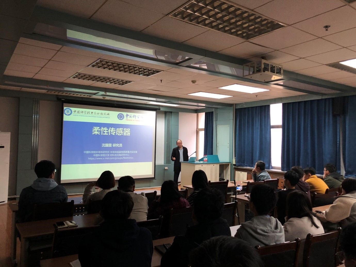 在报告中,沈研究员首先讲解了柔性电子技术的概念及其优异的性能,从而引出其在信息、能源、医疗、国防等领域的广泛应用前景。 沈研究员深入浅出地介绍了其课题组近年来在基于半导体纳米材料的柔性传感器领域取得的部分优异研究成果,包括设计和研制柔性光电探测器、柔性气体传感器以及柔性压力传感器等 。与此同时,沈研究员还列举了目前在柔性传感器领域其他研究人员所做的优秀工作并且对柔性传感器的发展前景以及对解决我国当前传感器卡脖子问题的相关技术做了展望 。最后,沈研究员就相关科研学术问题与在场师生进行了深入交流,极大地提高了师生们的科研兴趣和信心,为老师和同学的科研工作拓展了新的思路,报告在热烈讨论中圆满结束。