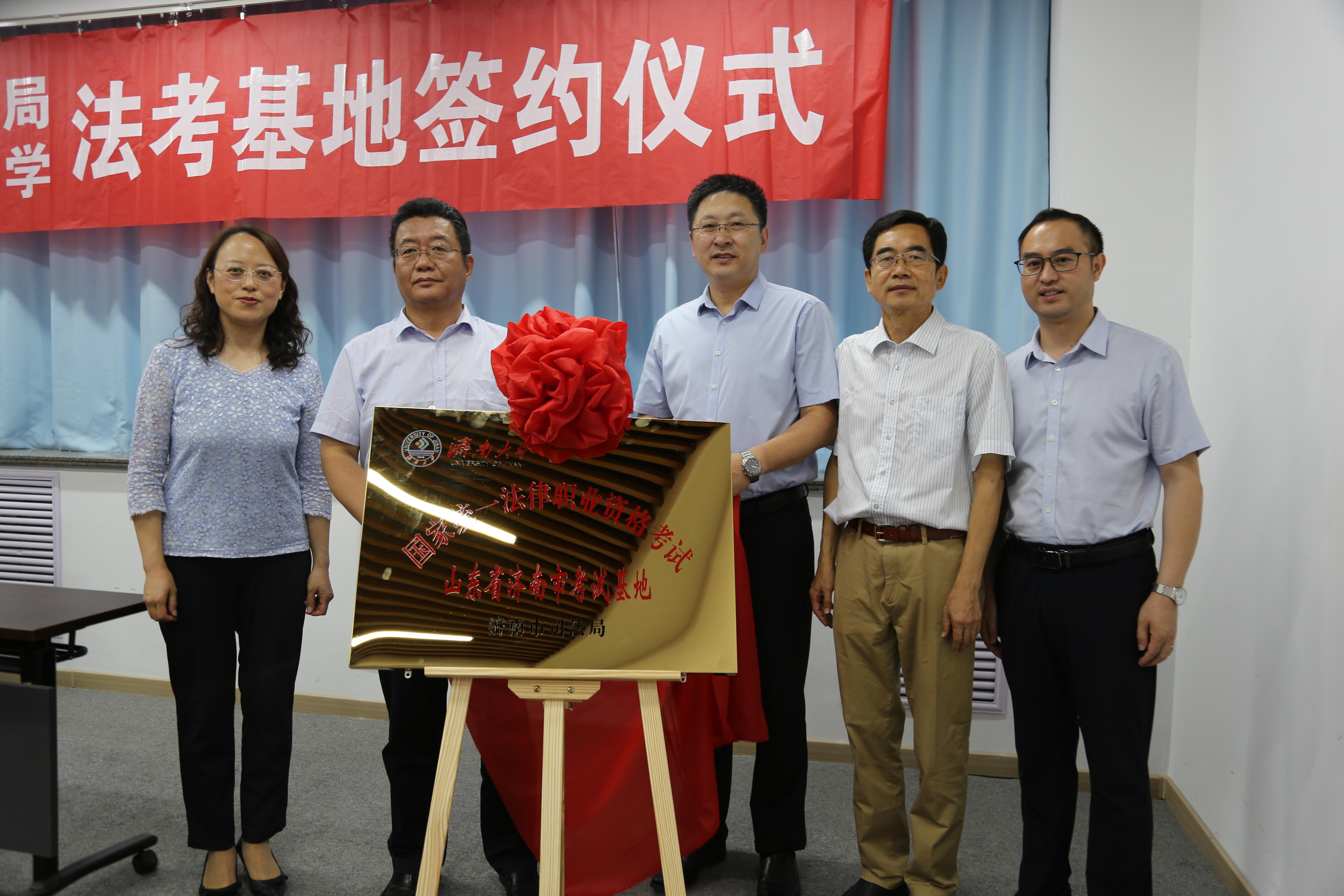 签署合作协议之后,济南市司法局副局长王春平同志和济南大学合作发展处处长卢旺同志为“济南法考基地”进行了揭牌。