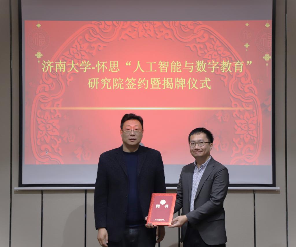 签约仪式上,杨阳介绍了研究院筹建及公司相关情况。9227新葡的京集团党委书记李超向陈图川教授颁发“人工智能与数字教育”研究院院长聘书。学校教务处处长、9227新葡的京集团院长陈贞翔与山东怀思总经理杨阳签订了设立“人工智能与数字教育”研究院合作协议。根据双方协议,济南大学和山东怀思科技有限公司将在智能机器人科技开发、高新技术产业化、科技信息交流、人才交流、人工智能及数字教育普及等方面开展全方位合作。