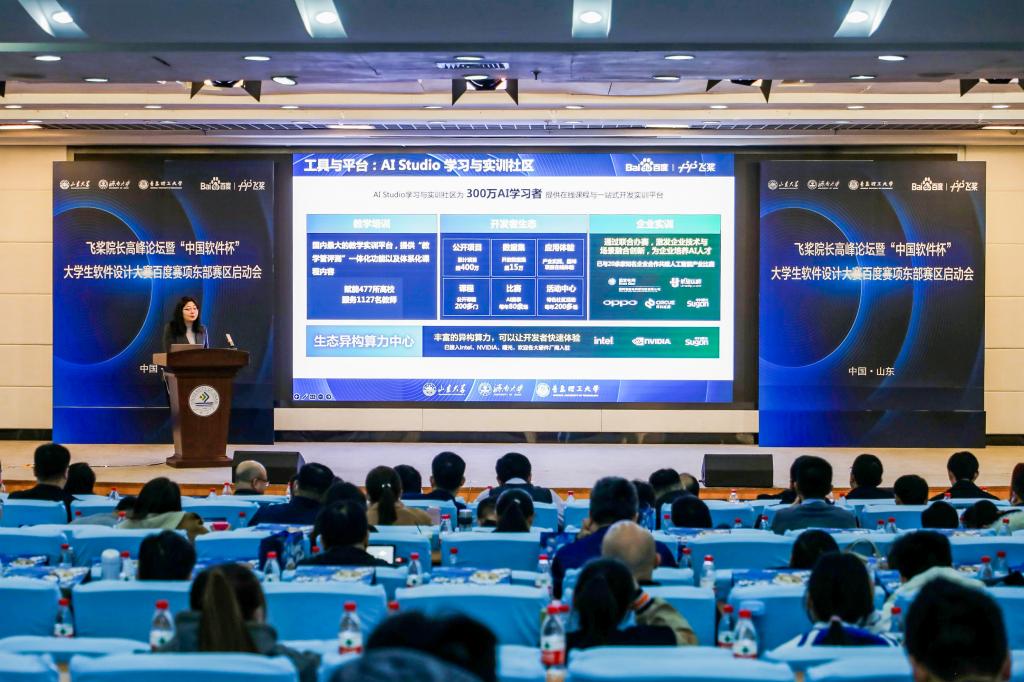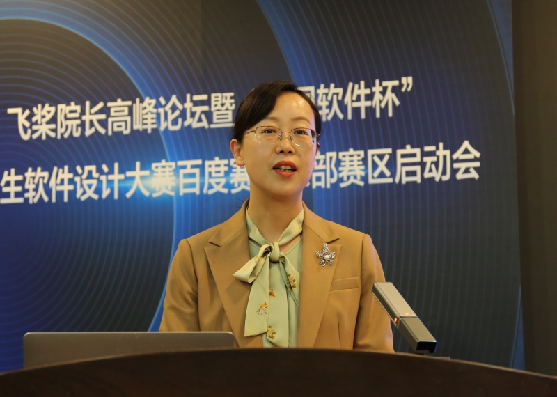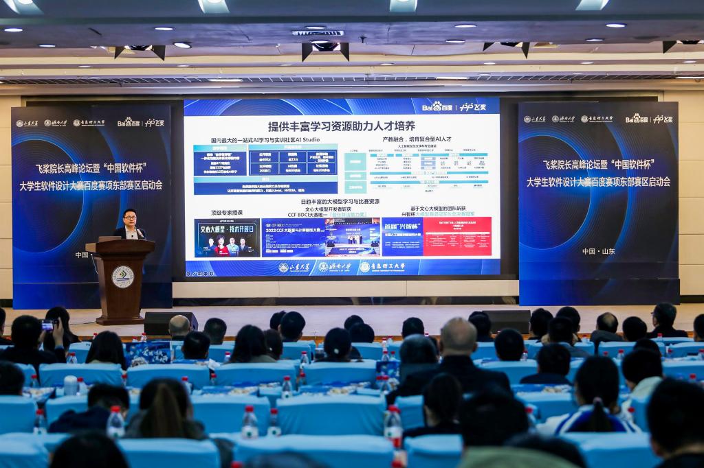 杨景波对莅临本次活动的各位领导、专家、嘉宾表示热烈欢迎,在致辞中介绍了济南大学的发展历程、办学情况、人才培养和科学研究等基本情况。杨景波表示,当前,以人工智能为代表的新一代信息技术,逐渐成为我国“十四五”期间推动经济高质量发展,建设创新型国家,实现新型工业化、信息化、城镇化和农业现代化的重要技术保障和核心驱动力之一。高校作为人工智能教育的主阵地,肩负着人工智能人才培养的重要使命,通过教育为社会各领域输出创新人才,支撑社会各领域转型升级以及人工智能等高新科技的创新发展。本次启动会的举办,对济南大学来说是一次难得的学习交流机会,也必将会对我校的学科建设、人才培养、科学研究和社会服务等各项工作起到积极的引导和推动作用。张源在致辞中向大会的举办表示热烈的祝贺,并介绍了市中区在校地合作、产学研融合等方面积极探索的高质量发展路径。她指出,未来市中区将围绕产业发展需要,加快建设人工智能协同培养基地,强化人工智能复合型产业人才培养,形成“人工智能+X复合型”人才培养新模式,打造具有市中特色的多层次人工智能教育体系。随后,青岛理工大学副校长王在泉、山东大学团委书记姜炳刚分别致辞介绍学校的基本情况,并表达对本次活动的高度关注以及对本次活动顺利开展的美好愿景。百度AI技术生态总经理马艳军博士和山东大学数学与统计学院副院长兼山东大学数据科学研究院副院长郭亮教授、百度飞桨教育生态运营负责人钱芳分别以《“深度学习平台+大模型”产业智能化基座》《校企融合,共探AI+X微专业人才培养新模式》《飞桨人工智能人才培养及2023年规划》为题做专题报告。
