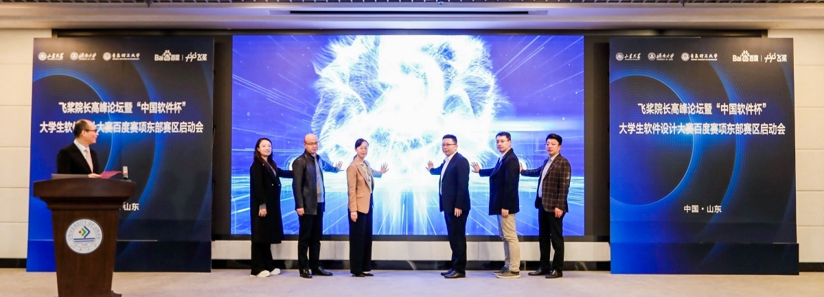 在与会各方的共同见证下,济南市市中区副区长张源、山东大学团委书记姜炳刚、青岛理工大学信息与控制工程学院院长田艳兵、济南大学团委副书记纪祥、百度AI技术生态总监周奇、“中国软件杯”大学生软件设计大赛副秘书长卢秀娜共同启动“中国软件杯”大学生软件设计大赛百度赛项东部赛区赛事。