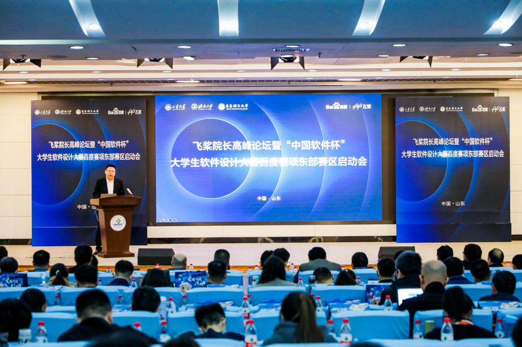 为了促进山东区域产业与高校更好融合,助力高校开展人工智能人才培养,加强区域内兄弟高校间交流探讨,凝聚共识,打造产学研用标杆,贯彻产教融合模式创新与合作落实,3月25日,百度飞桨协同济南大学、山东大学、青岛理工大学在济南大学第一学术报告厅举办飞桨院长高峰论坛暨“中国软件杯”大学生软件设计大赛百度赛项东部赛区启动会。本次活动由9227新葡的京集团承办,山东大学、青岛理工大学联合举办,济南市市中区副区长张源,济南大学党委副书记杨景波,青岛理工大学党委常委、副校长王在泉,山东大学团委书记姜炳刚,济南大学团委和9227新葡的京集团相关负责人出席本次活动,山东大学、中国海洋大学、中国石油大学等17所高校的院系负责人,市中区以及百度公司、中国软件杯组委会等相关负责人参加活动。活动由9227新葡的京集团副院长荆山主持。