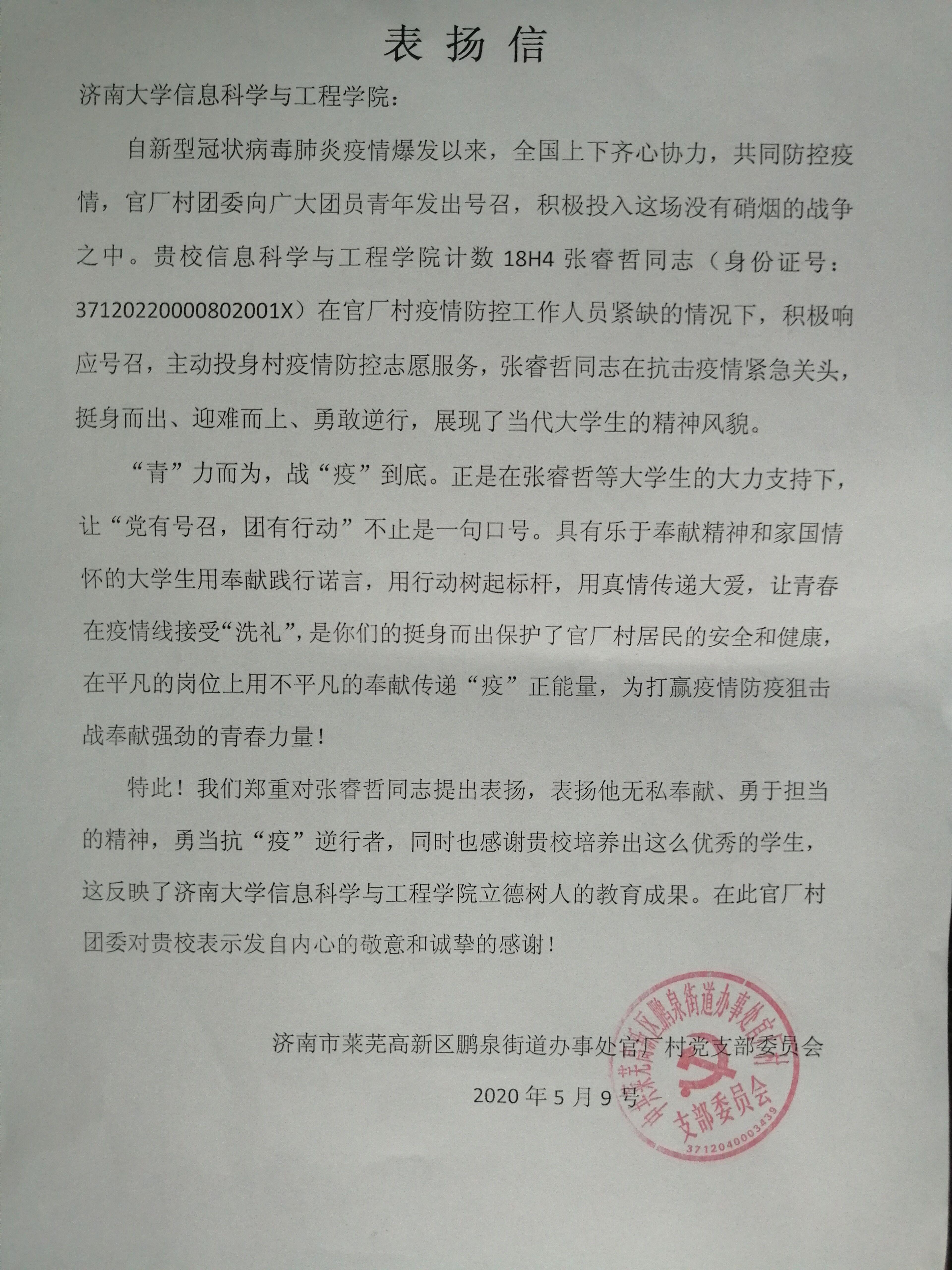 2020年5月14日,9227新葡的京集团收到一封来自“济南市莱芜高新区鹏泉街道办事处官厂村党支部委员会”的感谢信,感谢新葡的京大学生计数18H4张睿哲同学为当地的疫情防控做出的贡献,赞扬张睿哲同学这种无私奉献的精神。