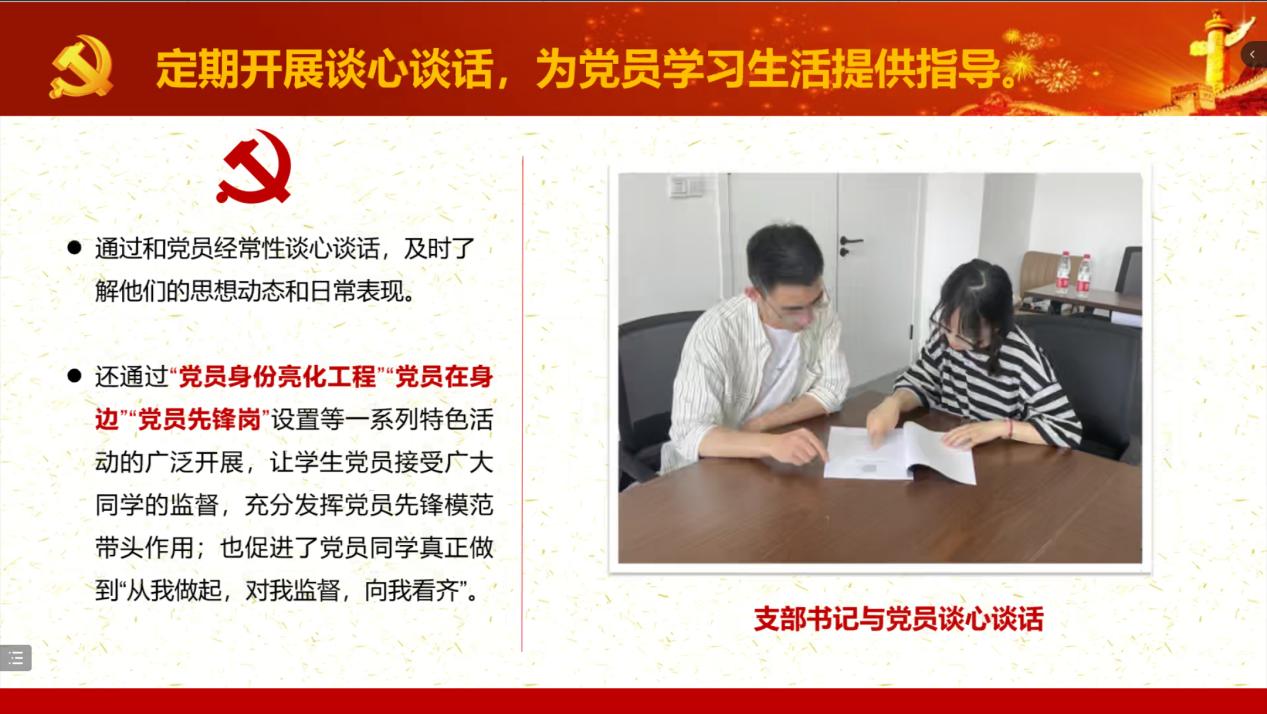 最后,李超书记总结讲话,他对各党支部书记对此次述职考核工作的精心准备和一年来的辛勤付出表示感谢,对各党支部克服疫情困难高质量完成各项工作表示感动和祝贺,对进一步抓好党支部党建工作提出三点建议,一是要以政治理论学习为抓手,进一步落实思想建设责任。深入学习贯彻习近平新时代中国特色社会主义思想和党的二十大精神,强化理论武装,将学习党的二十大精神的理论成果转化为推动学院事业发展的实践力量。二是要以过硬党支部建设为抓手,进一步加强基层党支部建设。认真贯彻落实《中国共产党普通高等学校基层组织工作条例》《中国共产党支部工作条例(试行)》,创新党支部活动方式,持续培育“一支部一品牌”党建特色品牌,深入推进党建联建共建,增强党支部活力,培育高质量党建创新成果。三是要以党员队伍建设为抓手,发挥党员先锋模范作用。对党员开展多形式、分层次的教育培训,加强党员教育管理监督,进一步完善督查和考核评价机制,加强分类指导,细化责任清单,发挥党员在课程思政、学风建设、学科竞赛等方面的作用。
