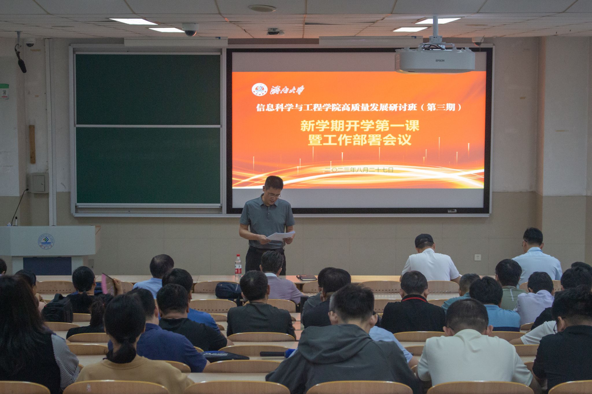 夏卫东首先向全体教职工传达了学校2023年暑期领导干部读书班和新学期全校领导干部会议精神,并结合学院工作实际,对新学期重点工作进行了动员和部署。他指出,今年是全面贯彻落实党的二十大精神的开局之年,是贯彻落实学校第四次党代会精神、实施学校“十四五”发展规划的关键之年。学院正处在探索新的高质量发展之路的关键时期,全院上下要增强责任感、紧迫感,坚持问题导向、效果导向,奋力突破、攻坚克难,巩固主题教育成果。全体师生要紧扣学校“一二三”发展思路和“四五六”战略部署,聚焦学校“冲一流、进百强”发展任务,强化党建引领、学科引领、创新引领,牢固树立全院上下“一盘棋”的思想,担当责任、苦干实干,协同行动、积极探索,共同推动学院高质量发展再上新台阶。