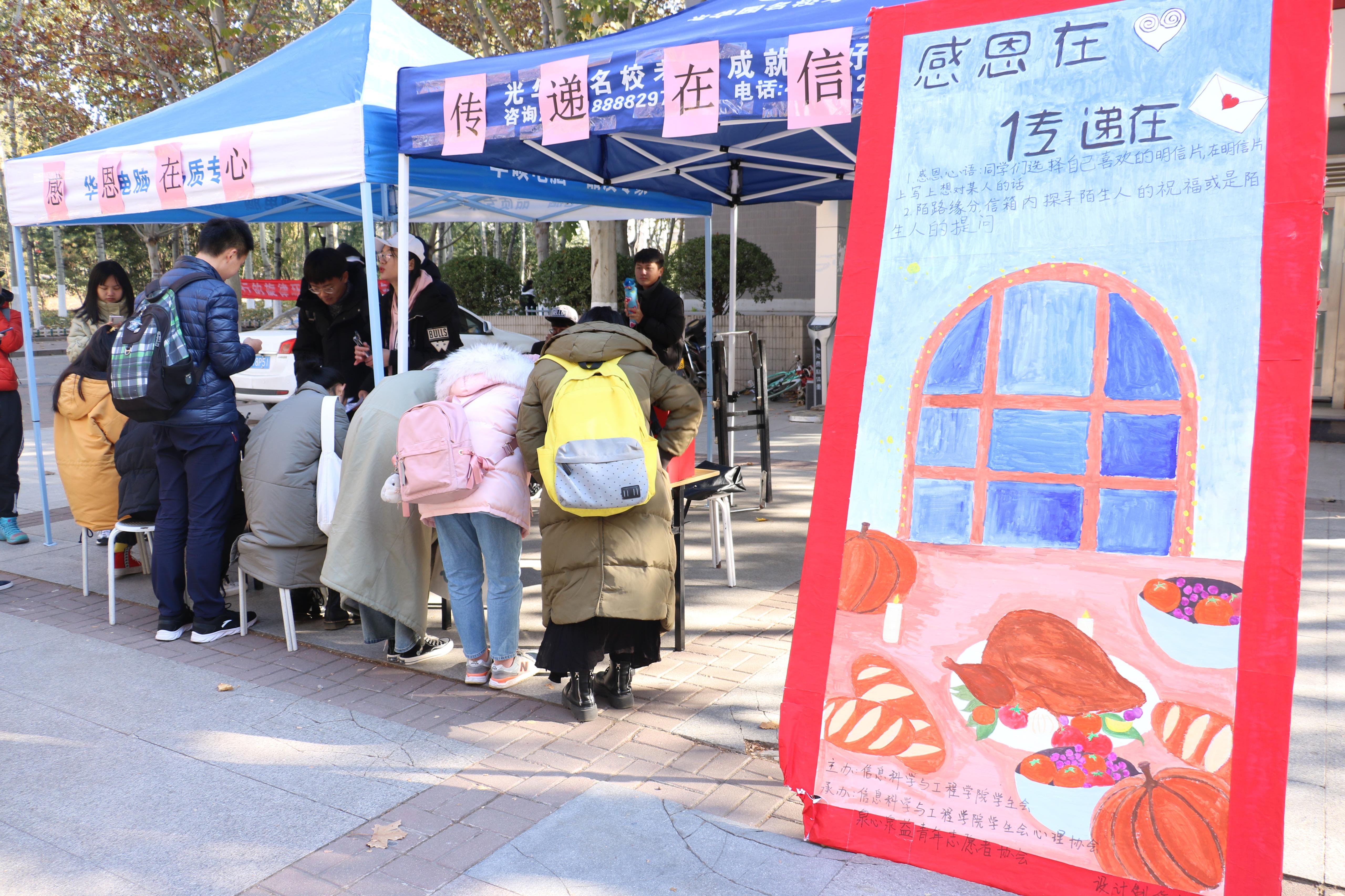 恩情心中记,感恩在行动。感恩节来临之际,为弘扬感恩精神,丰富校园文化,营造积极向上校园文化氛围,推动校园文化建设,让我们彼此的心更近一步。济南大学信息学院心理协会与泉心泉益青年志愿者协会共同组织的感恩节特别活动于11月28日上午9时在八食广场举办,这个活动让寒冷的冬天多了一分温暖,而这份温暖也传达到每个济南大学学子的心间。