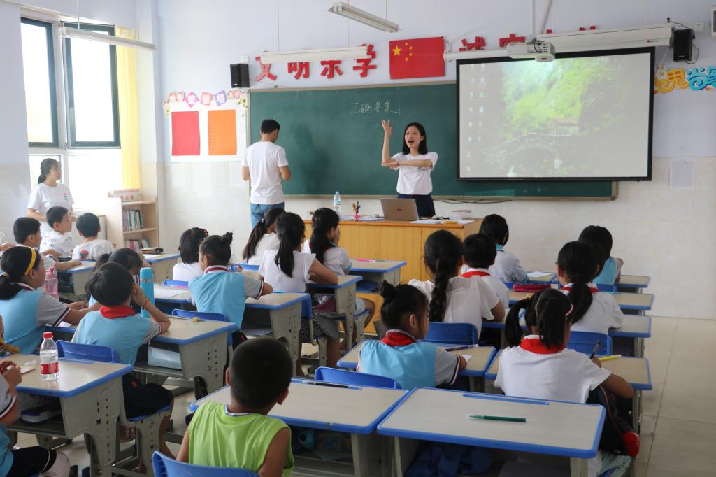 迈进教室,一双双清澈纯真的眼睛望向我们,在一番简单的自我介绍后,我们与30多名孩子一一相识。之后孩子们不断向我们抛出各种问题,热络的询问仿佛我们原来就认识一般,在与他们交流的过程中,我能从他们的眼神中看出他们对我们的到来所表现的欣喜与好奇,之前忐忑不安的心完全平静了下来,我们对今天的课堂充满信心。