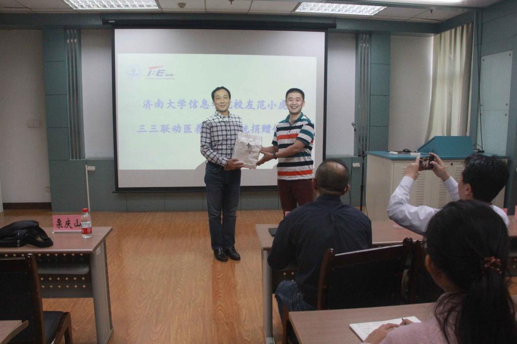 9月26日下午,济南大学信息学院校友范小虎三三联动医养融合系统捐赠仪式在12教703会议室举行。博虎科技有限公司执行总裁范小虎、校医院党委书记高春梅、校医院院长栗庆山、校友办主任杨延鲁、信息学院党委书记邱鲁军、信息学院院长董吉文、信息学院党委副书记、副院长董晓宁、信息学院副院长陈贞翔和部分师生代表共同出席了捐赠仪式。