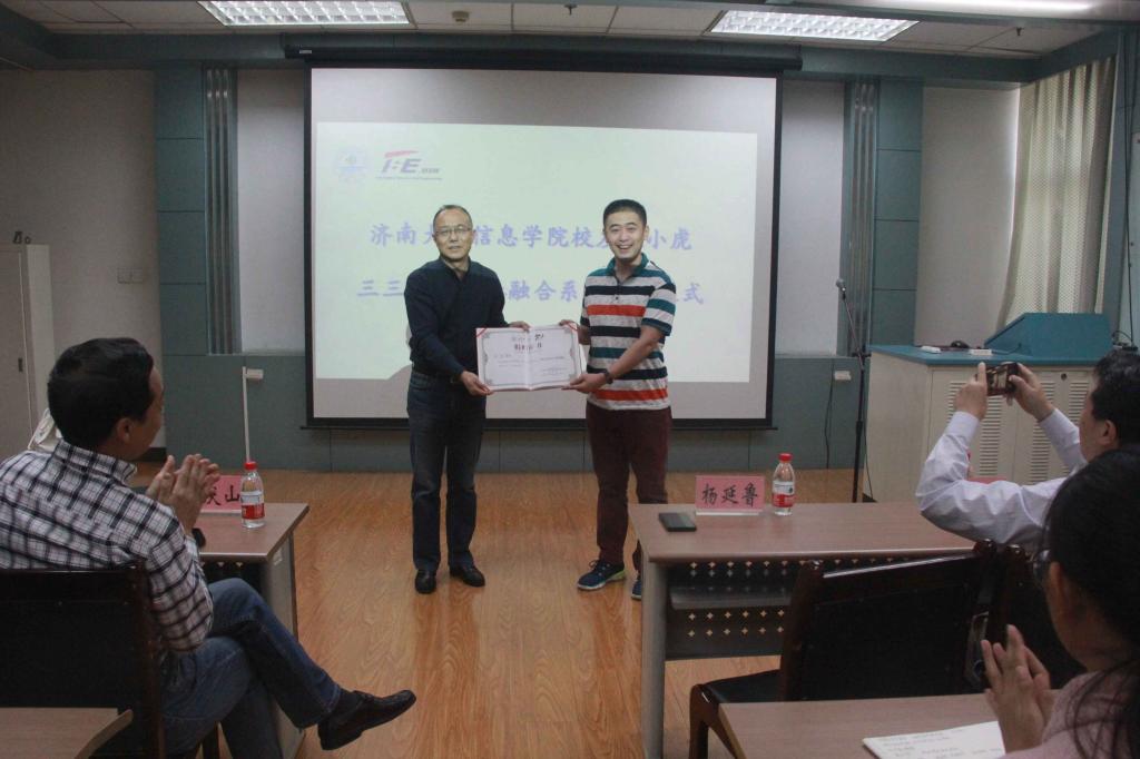 之后,济南大学校医院院长栗庆山发言。栗院长表示,感谢范小虎及博虎科技有限公司的无私捐赠,医养融合系统对校医院医疗质量的提升和数字化建设起到极大的助推作用,他们将努力做好设备的使用和推广工作,更好的为师生员工服务。之后,校友办主任杨延鲁向范小虎颁发捐赠证书并讲话,他对范小虎表示感谢,对学院人才培养取得的成果给予肯定。最后,邱鲁军书记总结讲话,他勉励同学们向优秀校友学习,学好专业知识,更好的服务社会,学会感恩,回馈母校。